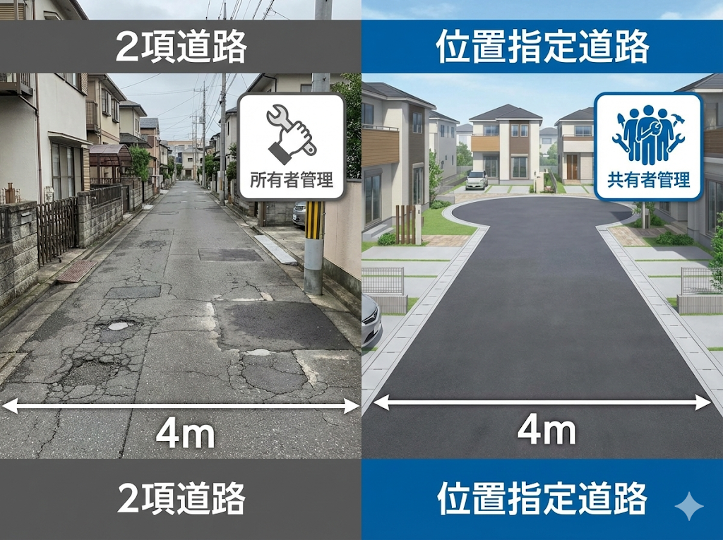 どちらも建築基準法上の「道路」として認められていますが、その成り立ちが全く異なります。